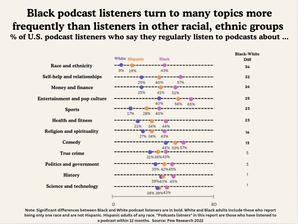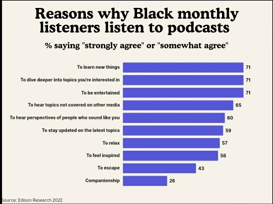 Recent Edison Research studies show that 75% of monthly Black podcast listeners actively seek out content that highlights Black stories and Black perspectives.