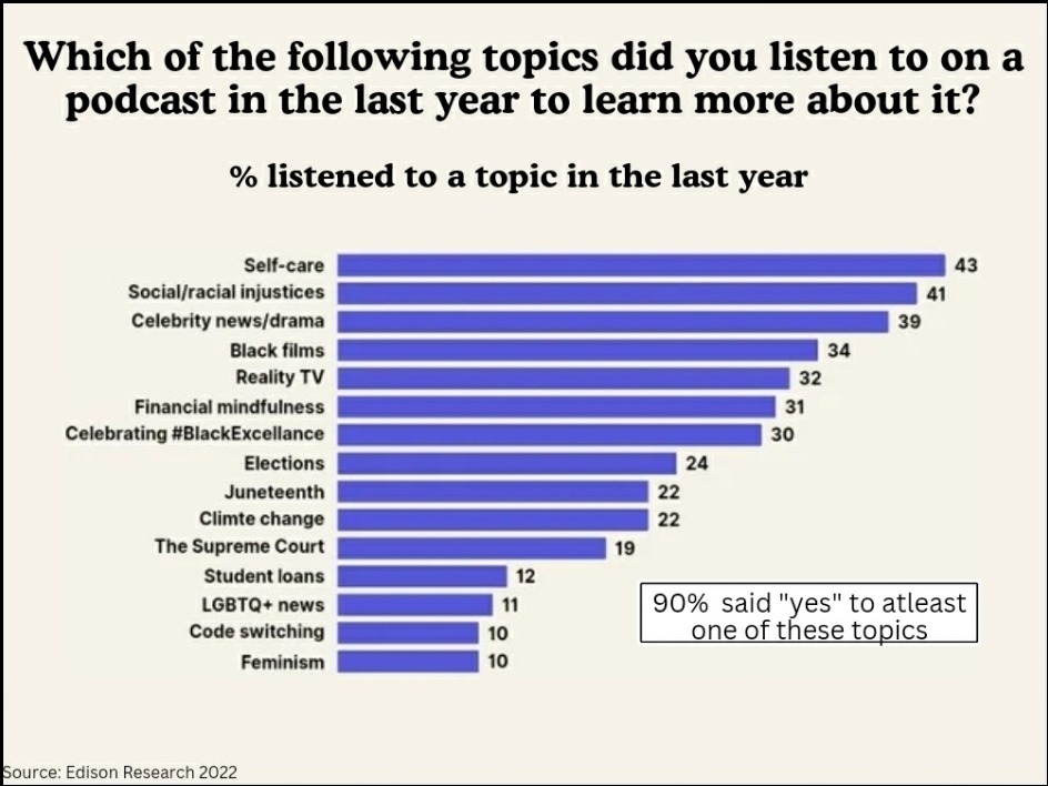 Her earlier suspicions have now been confirmed, as new data from Edison Research shows a marked rise in Black listenership. In their survey over 2,000 podcast listeners, 43% of the U.S. Black adult population are now monthly podcast listeners—5 points higher than the U.S. total population.